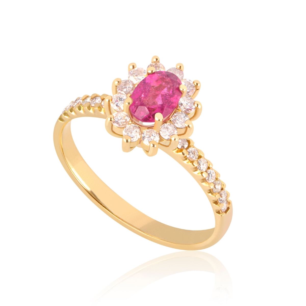 O Anel Turmalina Rosa com Brilhantes em Ouro 18K é uma joia que une intensidade e elegância em uma composição clássica. A turmalina rosa natural, com lapidação oval, é cercada por um halo de brilhantes que ampliam seu brilho e realçam a beleza da pedra central.